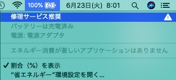 Mac でバッテリー関連のメニューバーを選択すると、「修理サービス推奨」のメッセージが表示されました。