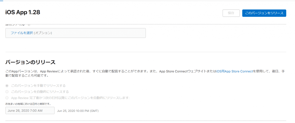 AppleのWeb画面が新しくなって、このタイマーセットがグレーアウト。機能していないので、「このバージョンをリリースする」でしかリリースできません。
