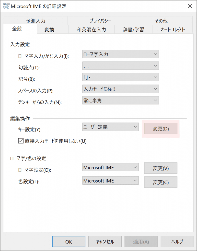 6.追加した「ctrl+J」の「入力/変換済み文字なし」欄で「変更」をクリックします。