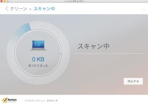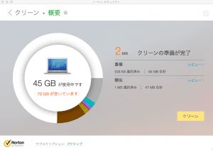 1.Mac版ノートンセキュリティのトップメニューから「クリーンメニュー」を起動すると、以下の画面が表示されるので「開始する」ボタンを押します。